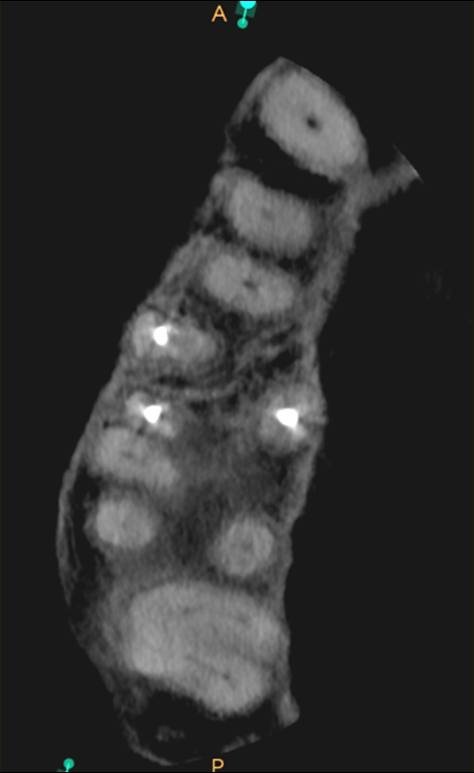 Fig 2. Imagen axial del diente 16 que muestra un conducto obturado en la raíz mesiovestibular.